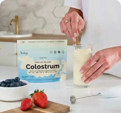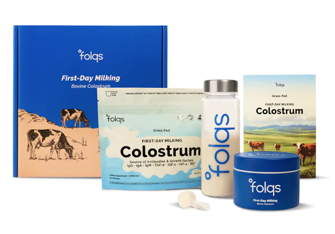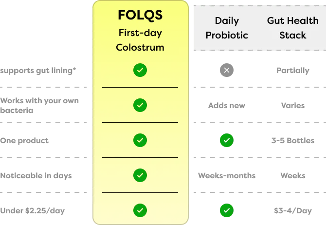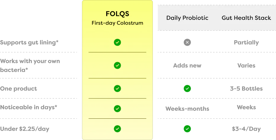 FOLQS colostrum is collected within the first 24 hours — when immunoglobulin concentration is at its peak.* Grass-fed cows. Low-heat processing to preserve bioactives. Every batch third-party tested. No fillers, no artificial anything. The average probiotic-prebiotic-enzyme stack runs $65–85/month.* FOLQS is $64/month — and it replaces the whole shelf.*